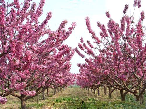 2. 絢麗海棠:絢麗海棠是一個花期較長的開花品種,春季開花具有很高的觀賞性,花朵為淡粉色到紅色,綿羊絨狀花苞密集在枝條上,花朵很大,花瓣呈倒心形。夏季開出小型紅色或黃色果實,果實較小,呈球形也可能是長棍狀的。